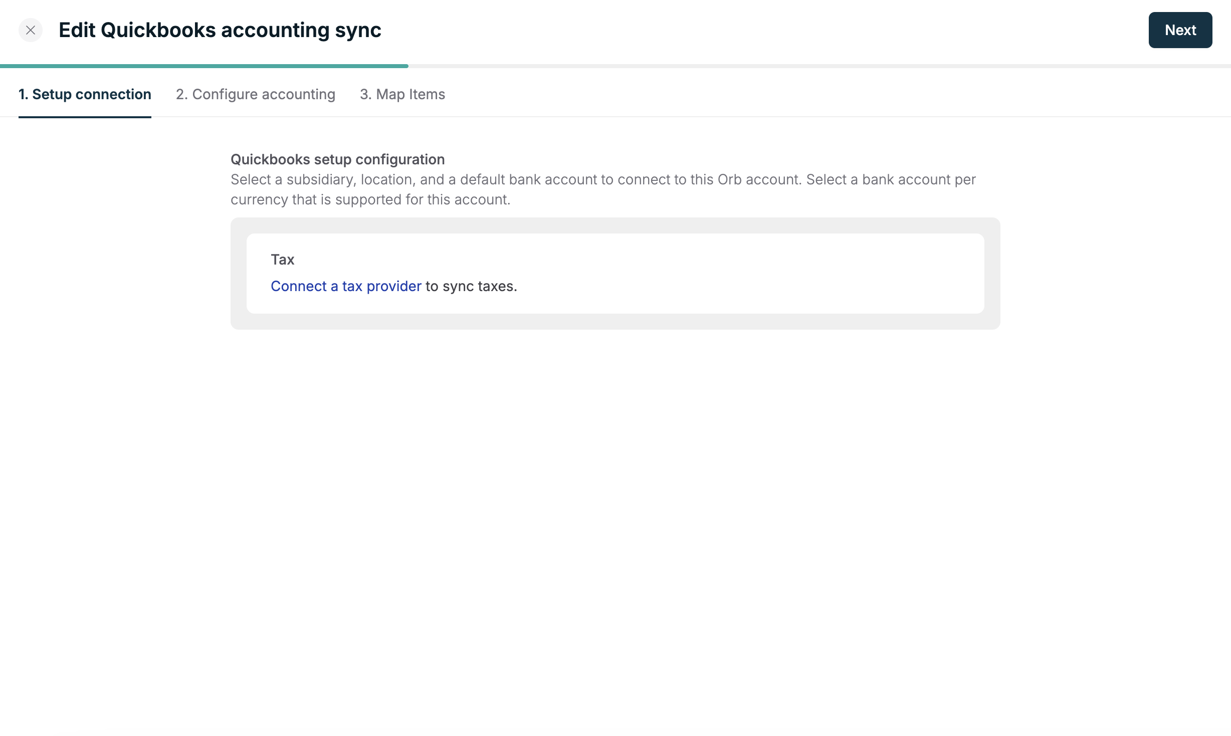 [Optional] Sync taxes to Quickbooks. After connecting to QuickBooks click the “Configure” button. Taxes will be synced as a separate line item when using the QuickBooks Accounting Sync. Select an external item in quickbooks to map taxes to.